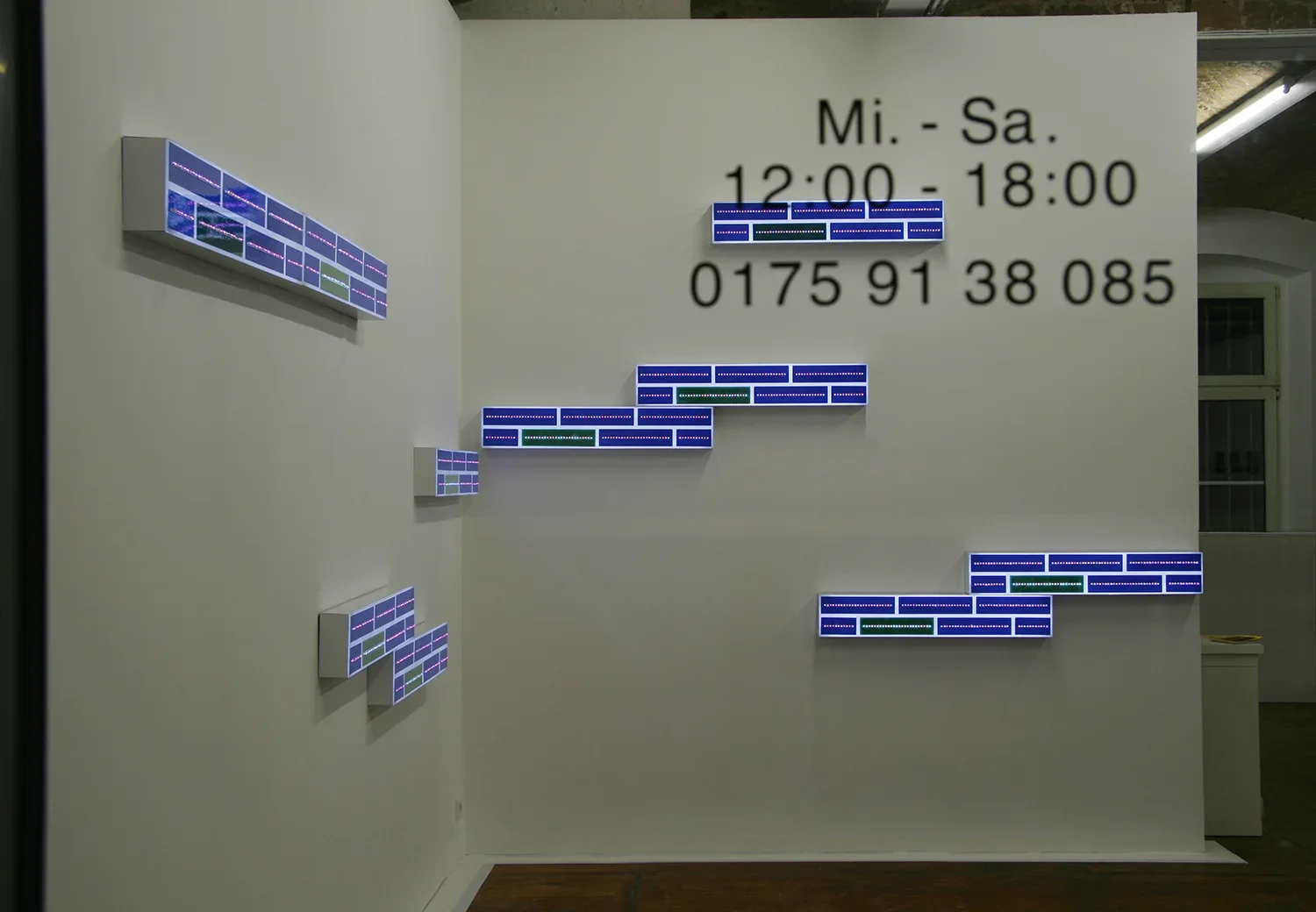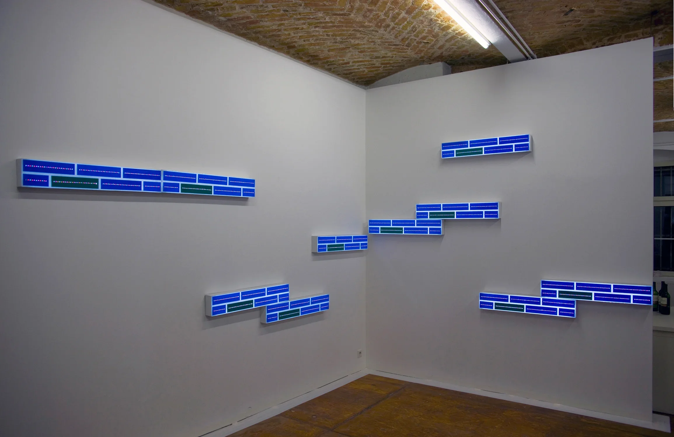 The installation All That’s Left was shown in 2010 at the East/West Project in Berlin, Germany. It consists of ten boxes with LEDs embedded in reflective sheeting, and backlit with white light. They were combined to transform the heavy feeling of salvaged masonry into an evocative, ethereal experience. Their blue and green hues complement the color of red bricks, and their variation echoes that found in brickwork of older buildings.