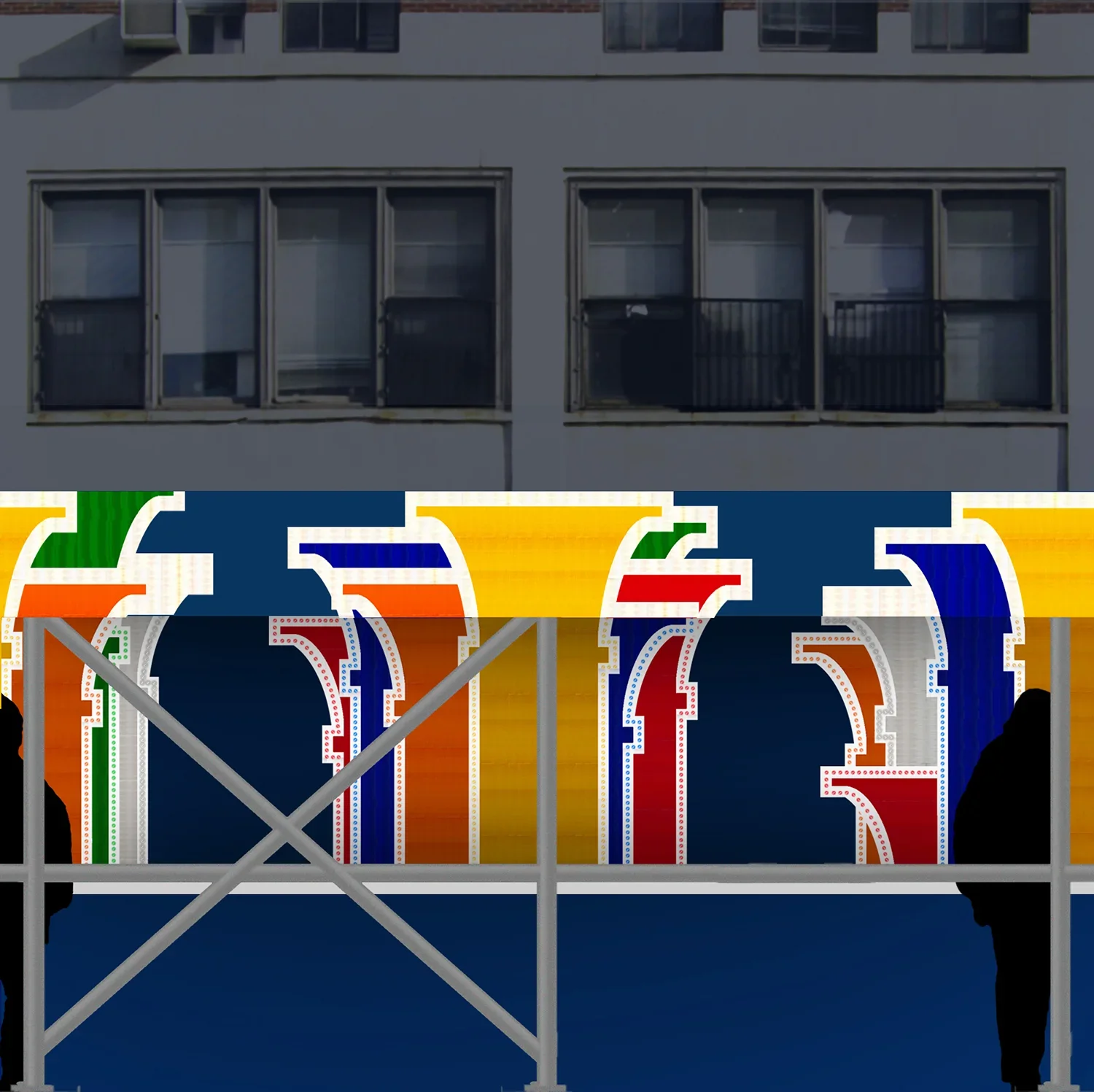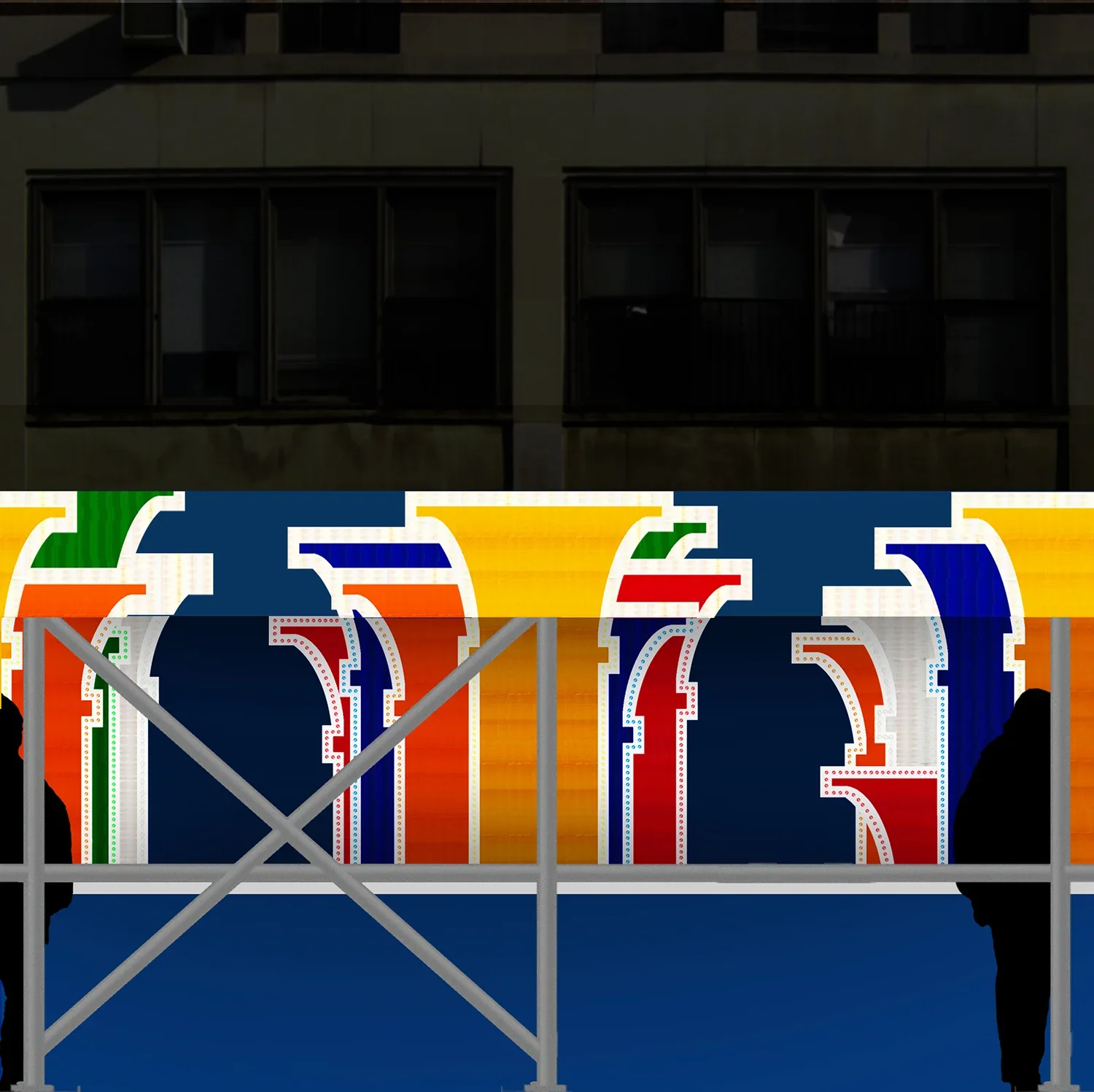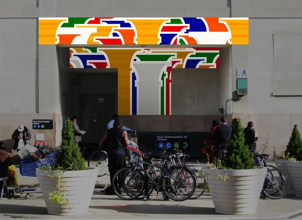 Colonnade, a light installation at the entrance to the Hoyt-Schermerhorn subway station in Downtown Brooklyn, marries technology to aesthetic elements to invite pedestrians into an urban fantasy world. Prismatic reflective sheeting forms a field of overlapping columns outlined by white light and bright LEDs, extending endlessly back into an imaginary space. The lintel above the subway entrance, exposed to bright sunlight, will be faced with an extension of the same imagery made only of the reflective sheeting.
