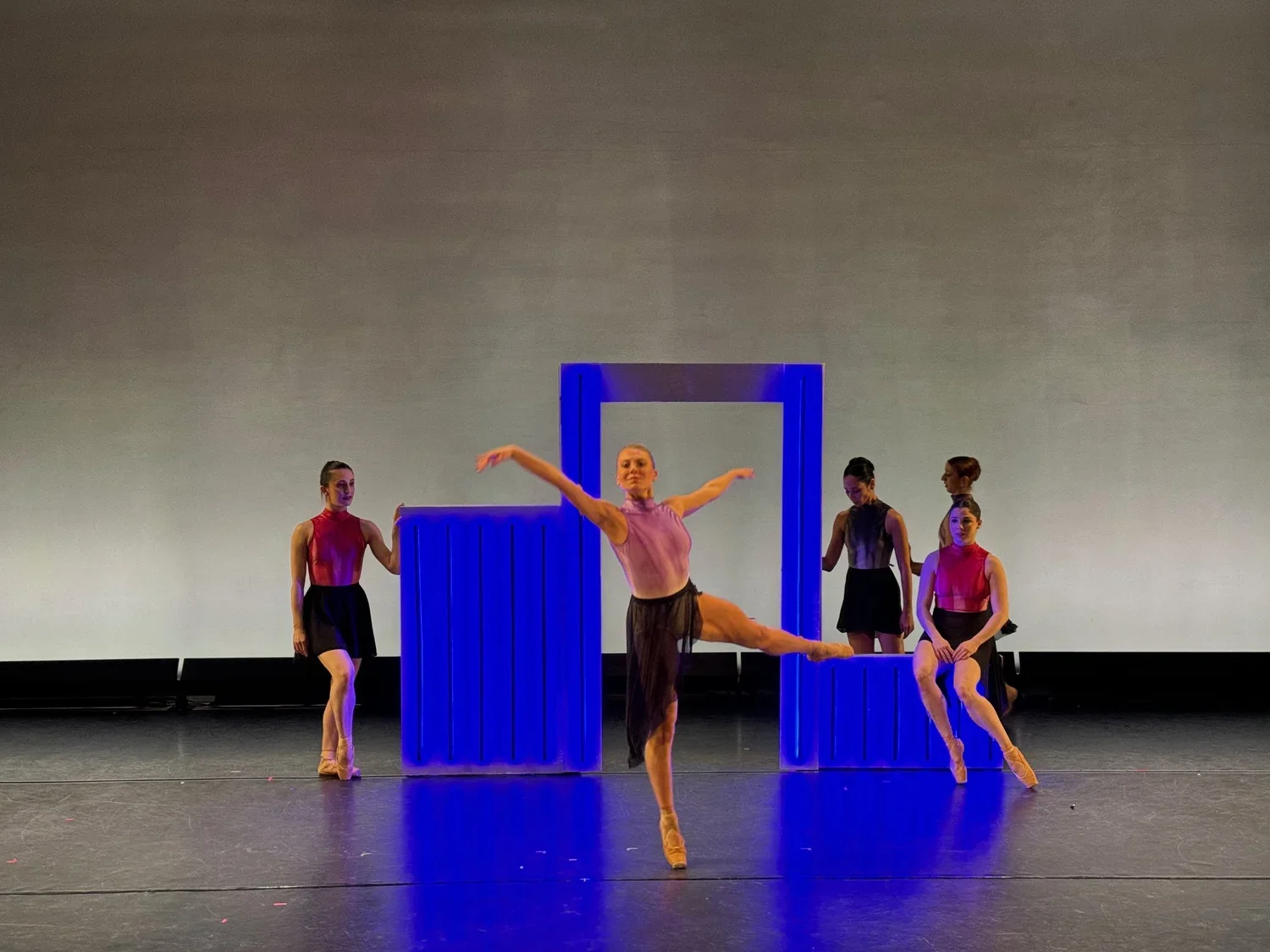 I created a set consisting of three sections faced with reflective road sign material and backlit by blue LEDs. The left section was a high panel, the middle was a doorway, and the right was a bench, giving the choreographer many ways to place the dancers.