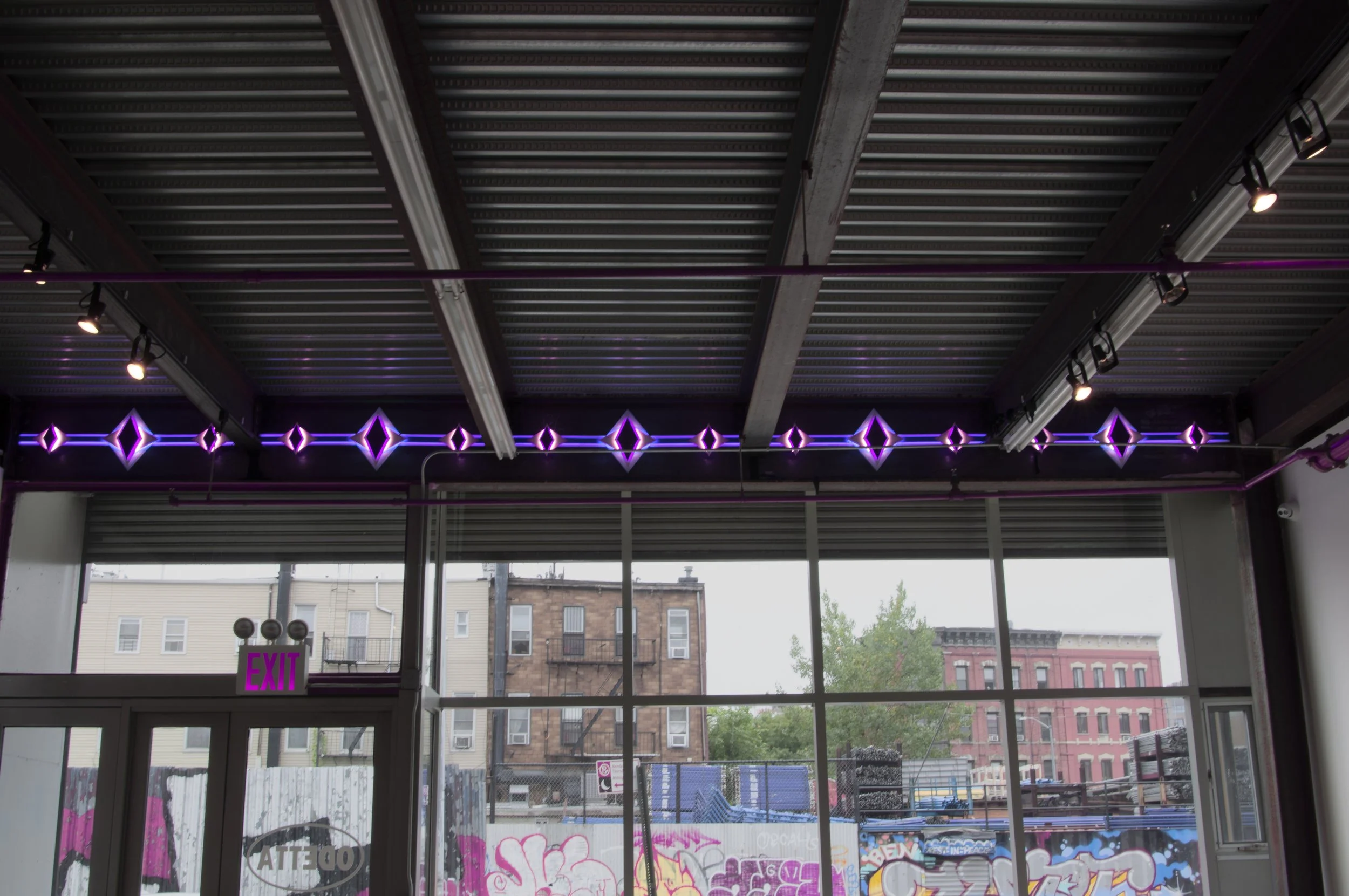 “Double Diamond” has two different configurations of diamonds made with layers of light, mounted onto strips connecting them. They beam onto reflective materials, creating a glowing frieze whose light radiates outward. T