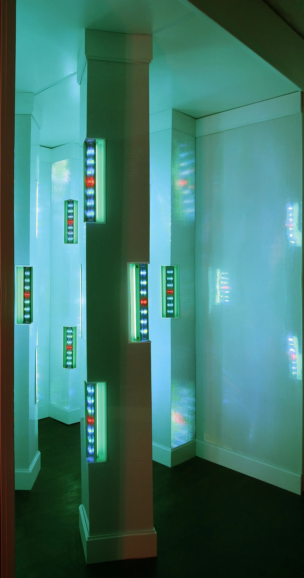 An installation at Dam, Stuhltrager Gallery with walls and columns covered with white prismatic reflective sheeting. Colored fluorescent lights contained in niches cut from the columns’ corners were faced with LEDs beamed through prism rods for a jewel-like effect. The sheeting glowed from the fluorescents, while simultaneously reflecting the LEDs. The viewer saw the multiple reflections on the surfaces, and at the same time felt like the walls are dissolving into endless space.