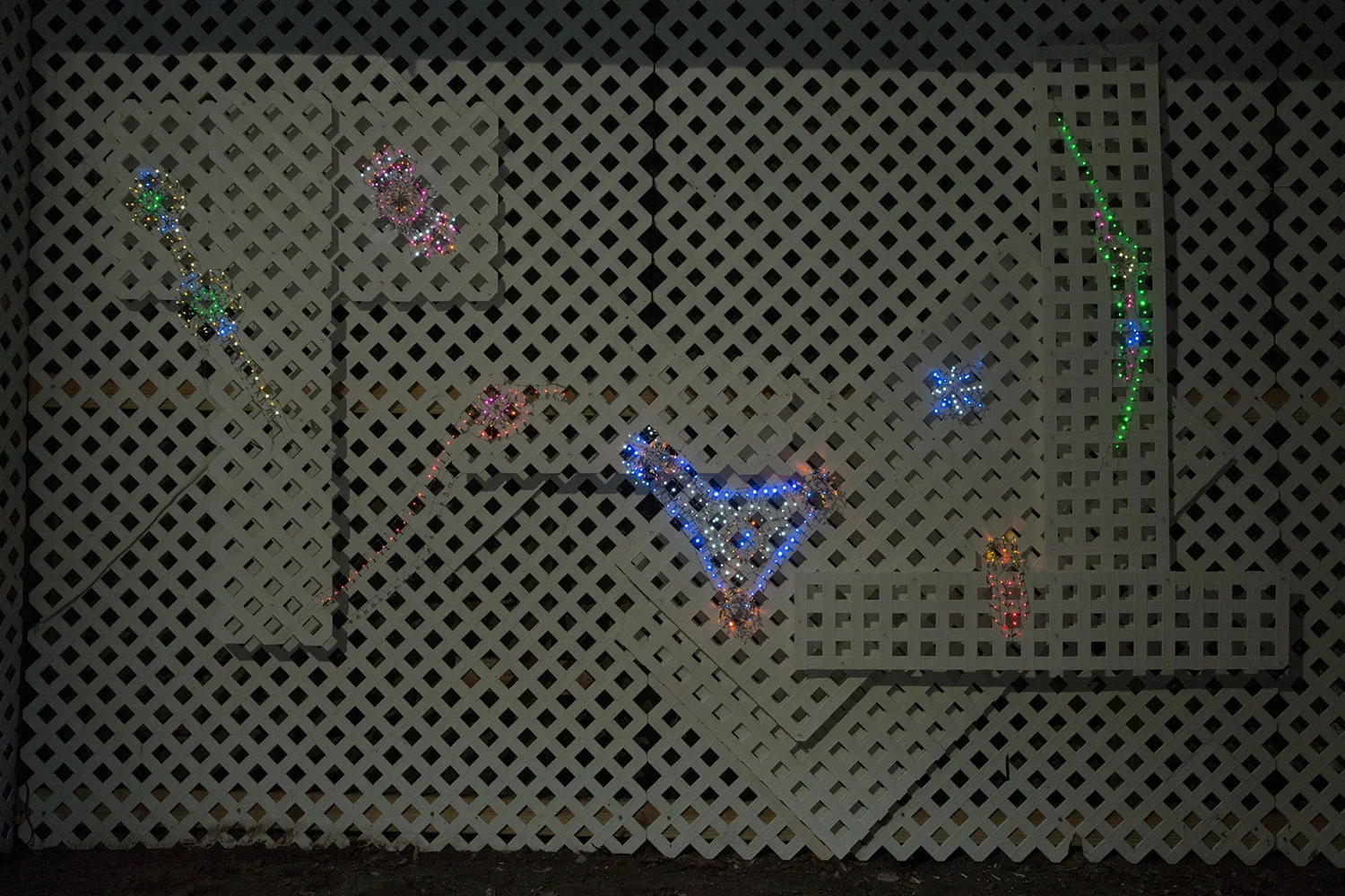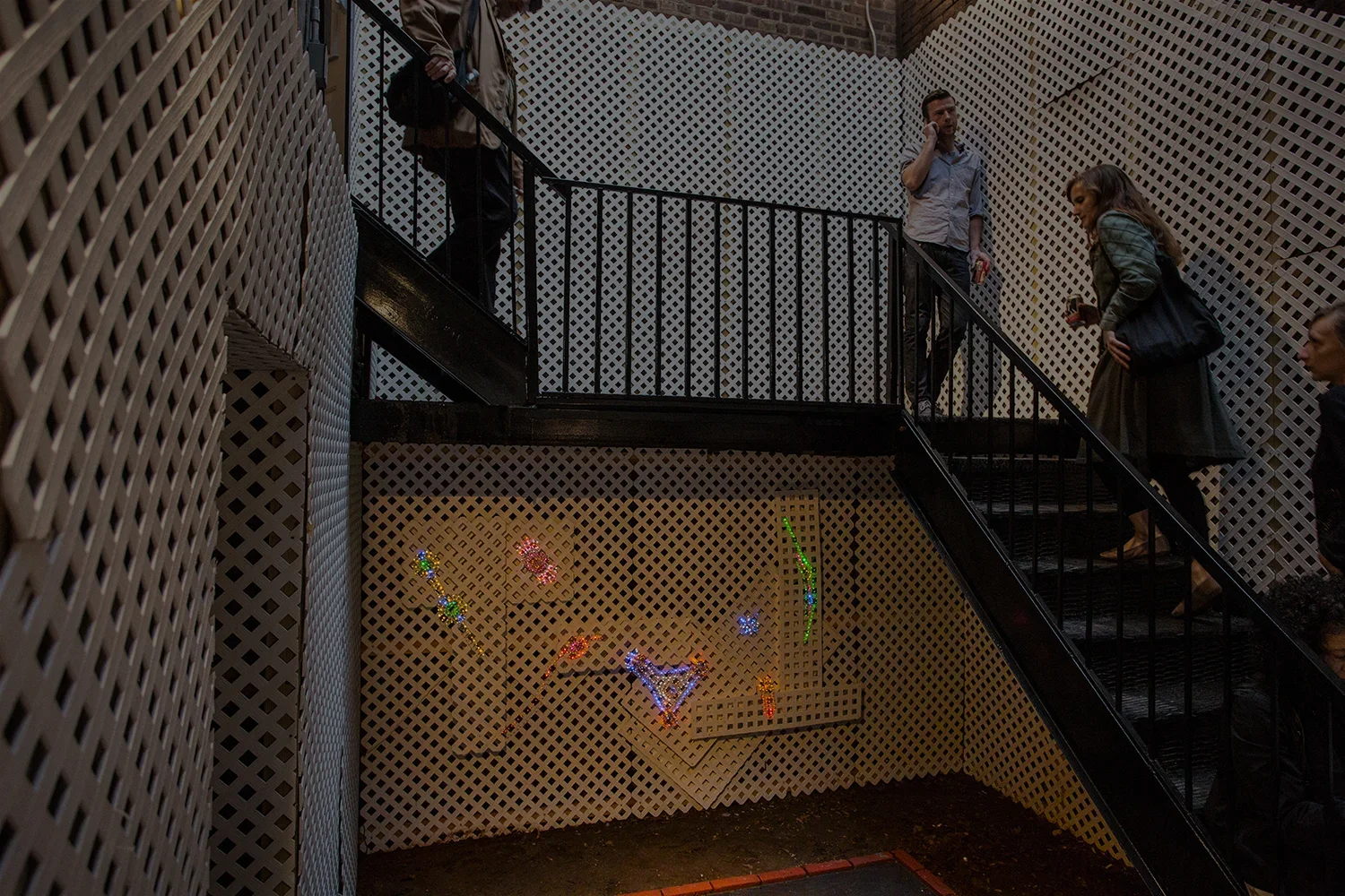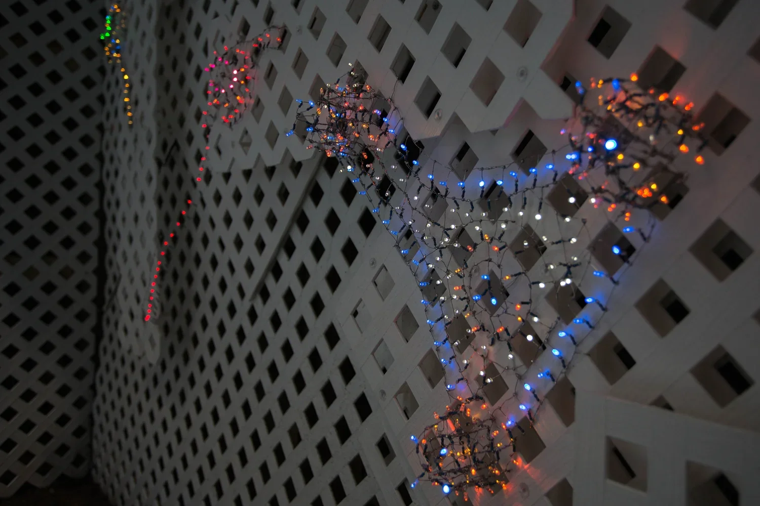 The existing PVC lattice in the backyard garden at the Brian Morris Gallery in New York CIty was the starting point for the site-specific installation Jacob's Lattice. Three layers of shapes cut out of the same material provided as the base for six organic sculptures made of various colors LEDs and wire, reminiscent of a hanging garden that the lattice is intended for.
