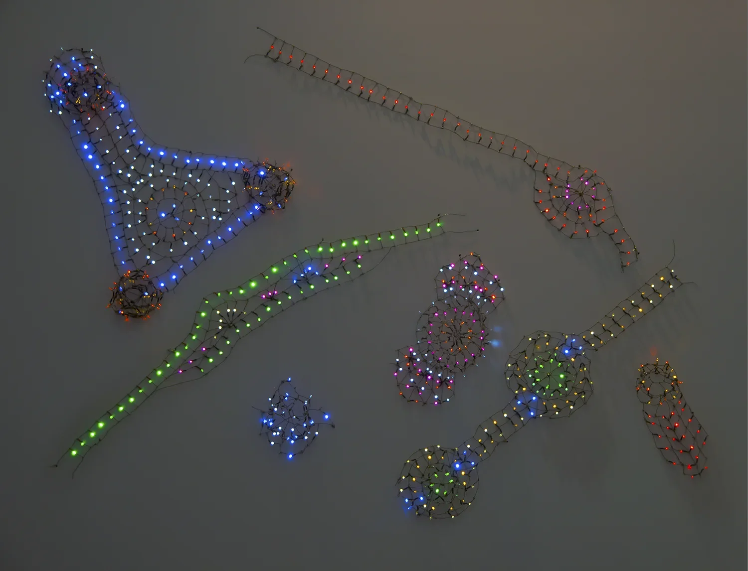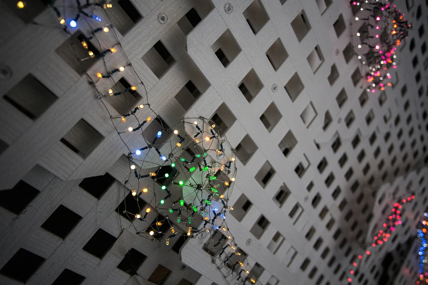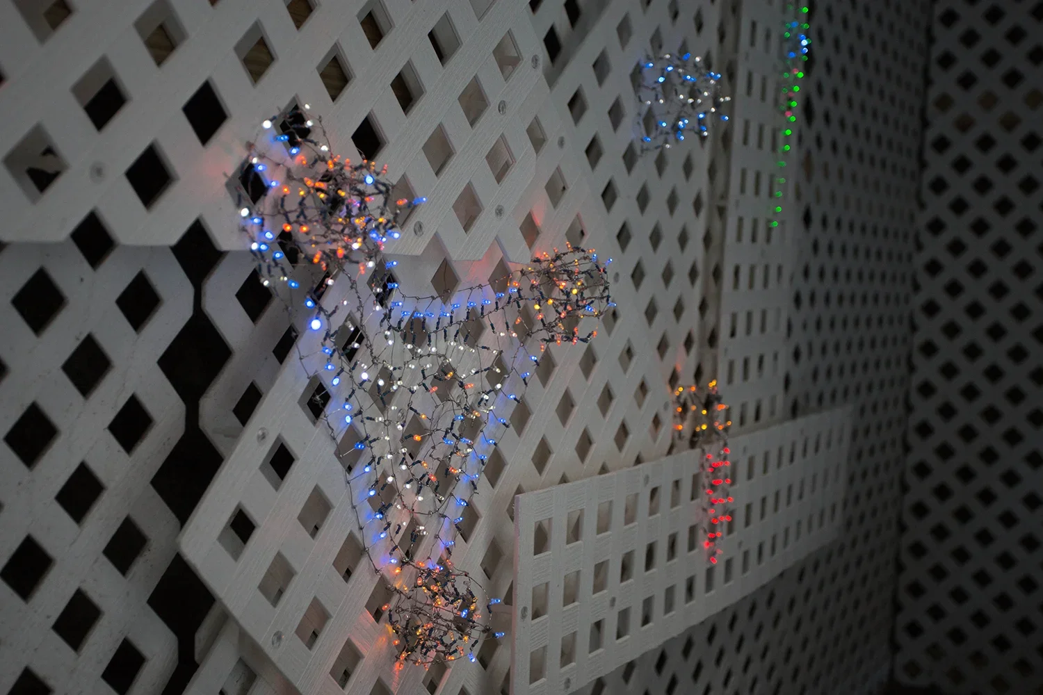 The existing PVC lattice in the backyard garden at the Brian Morris Gallery in New York CIty was the starting point for the site-specific installation Jacob's Lattice. Three layers of shapes cut out of the same material provided as the base for six organic sculptures made of various colors LEDs and wire, reminiscent of a hanging garden that the lattice is intended for.