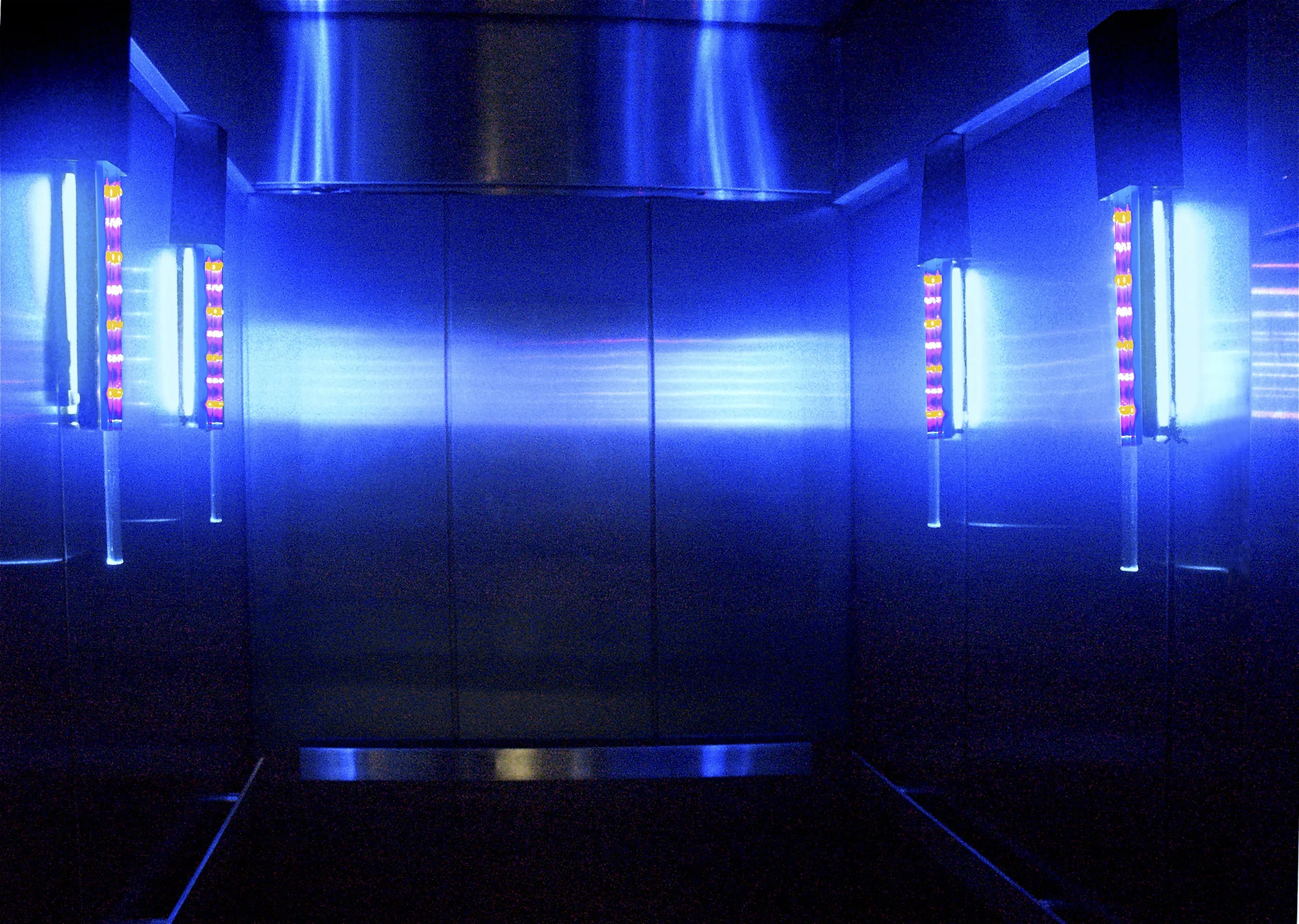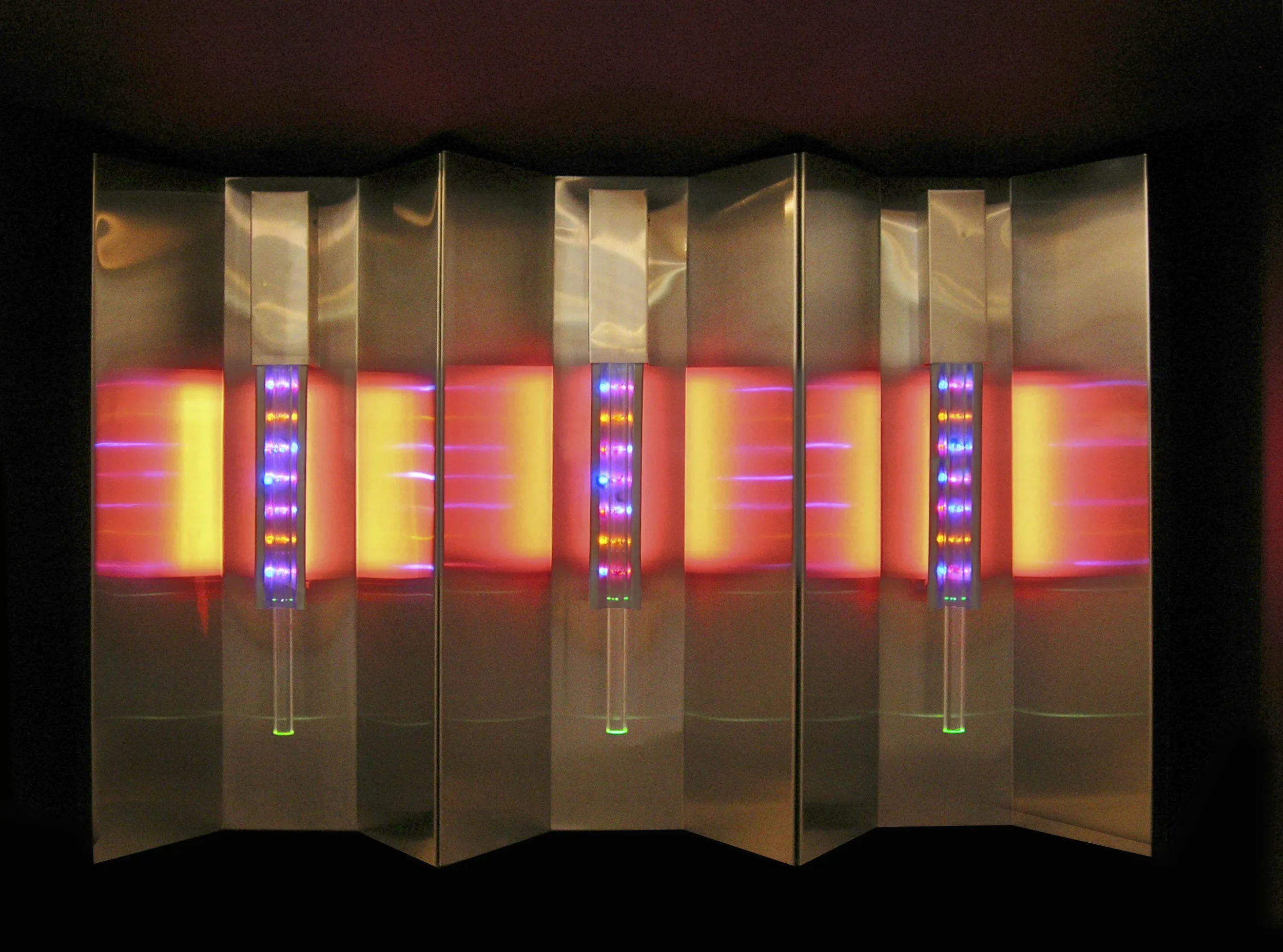 Light fixtures, with different colors of LEDs beamed through prism rods for a jewel-like effect, were nestled into angled stainless steel to create multiple reflections. These 3 pieces work together to amplify each other’s effects and create a warm, inviting wall piece from what should be a cold, sterile material.