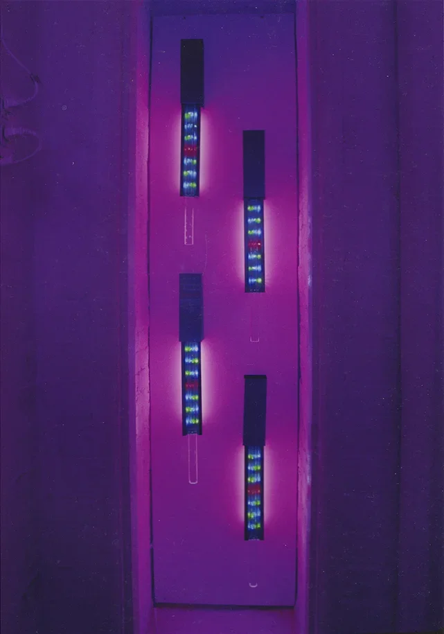 Light fixtures with different colors of LEDs beamed through prism rods for a jewel-like effect, and mounted onto the side wall and in the closet of PS 122 Gallery’s hallway.