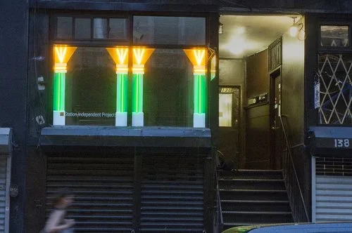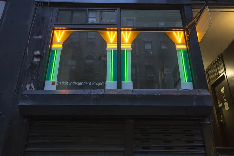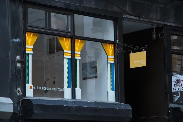 Shown here in the windows of Station Independent Projects in New York City in June 2015, this window installation uses LEDs and reflective road sign material to glow by day and at night.