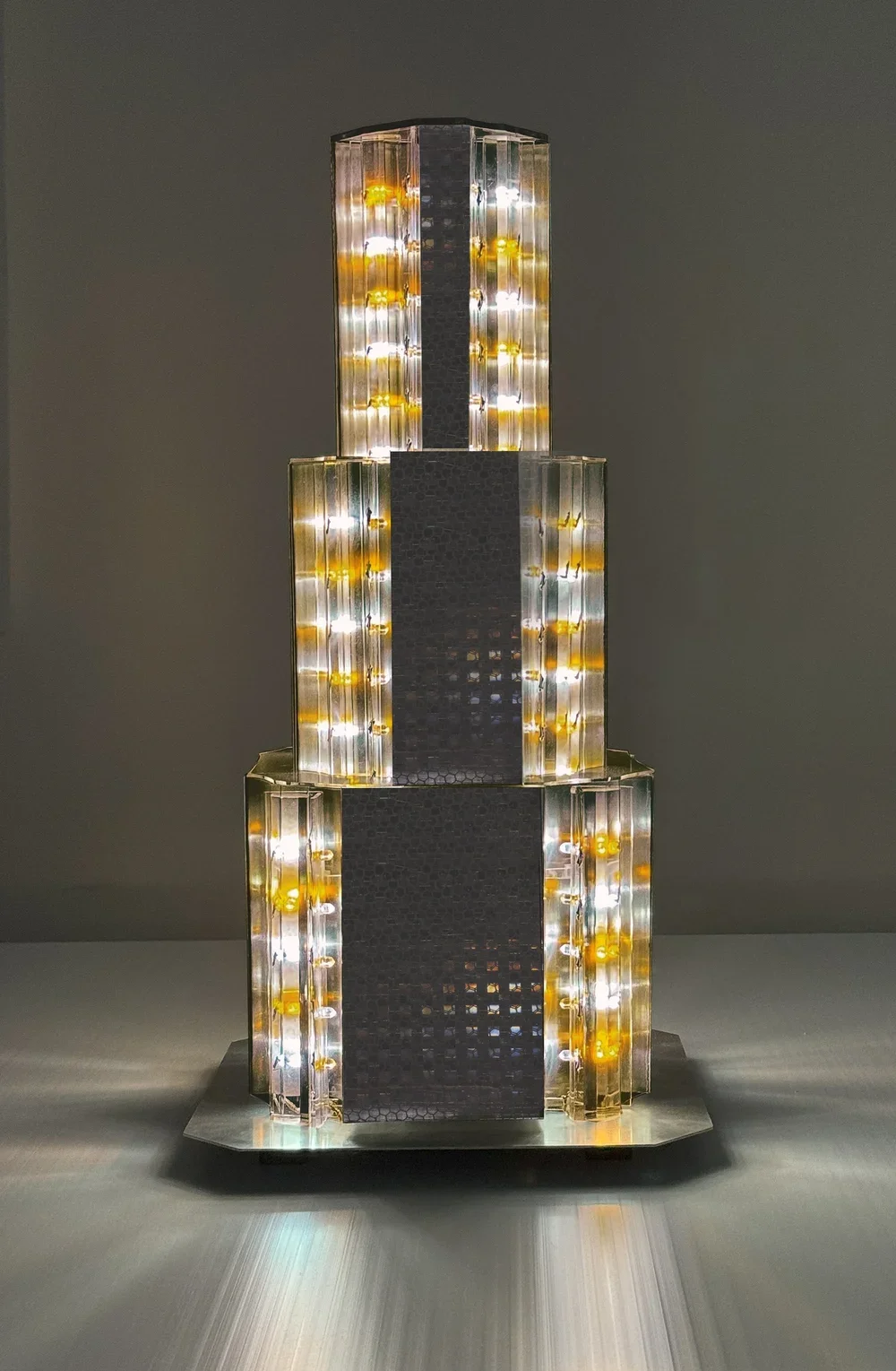 In this series I use prism rods, LEDs, road sign material and paint to make sculptures that are beautiful whether their lights are on or off. Yellow and white LEDs are hand-soldered into clear corner rods, and aimed into aluminum corners thus multiplying their reflections; prism rods were placed in front of them, blending their colors for a jewel-like effect. In between them are panels coated with white reflective road sign material, whose tiny beads catch the light from many different angles for a magical glow. Color is palpable, almost tactile. The entire effect plays with the viewer’s depth perception, and thus the perception of the sculpture’s size itself. It plays on your emotions, and takes you into a different, metaphysical world.