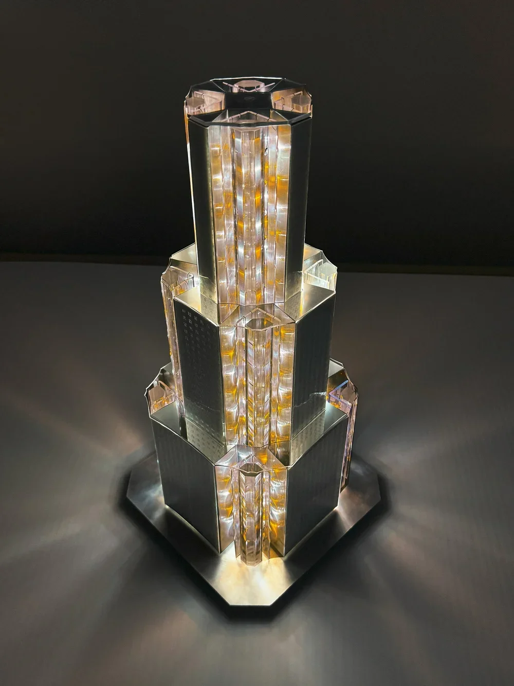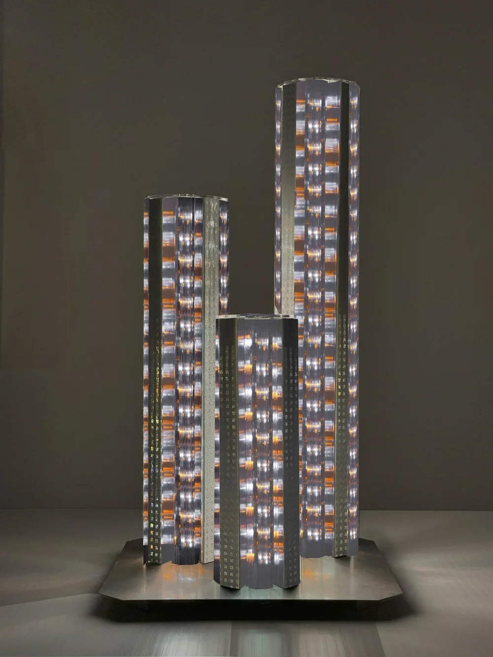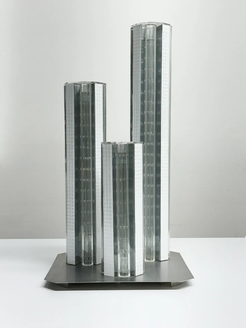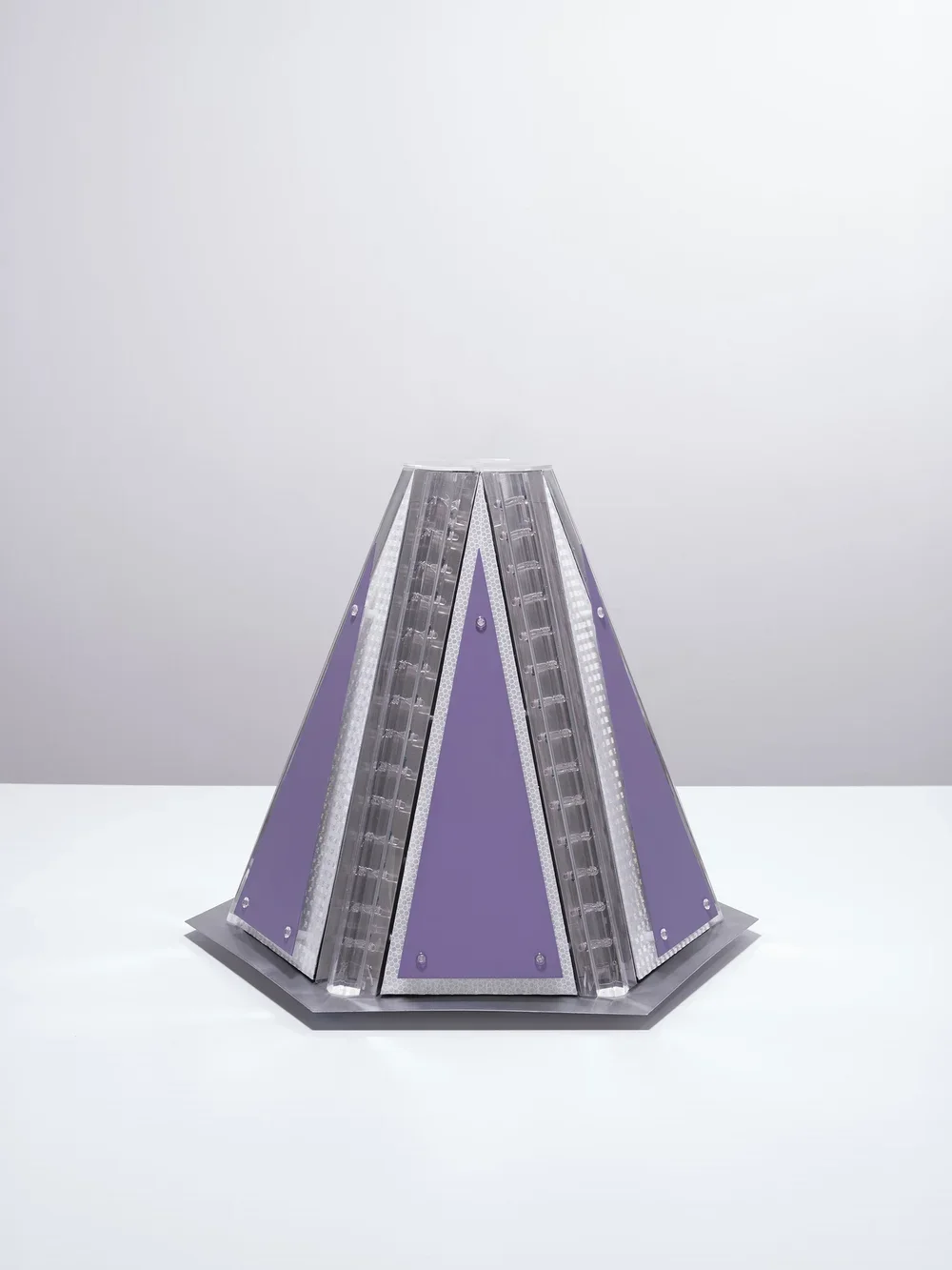 The Prism series of sculptures consists of tabletop sculptures that challenge the idea of monumentality. They range in height from 12.5 to 26 inches, yet are perceived as huge. Light is volume without mass: in contrast to large, solid sculpture, which may be confrontational, you can move through the space it inhabits.