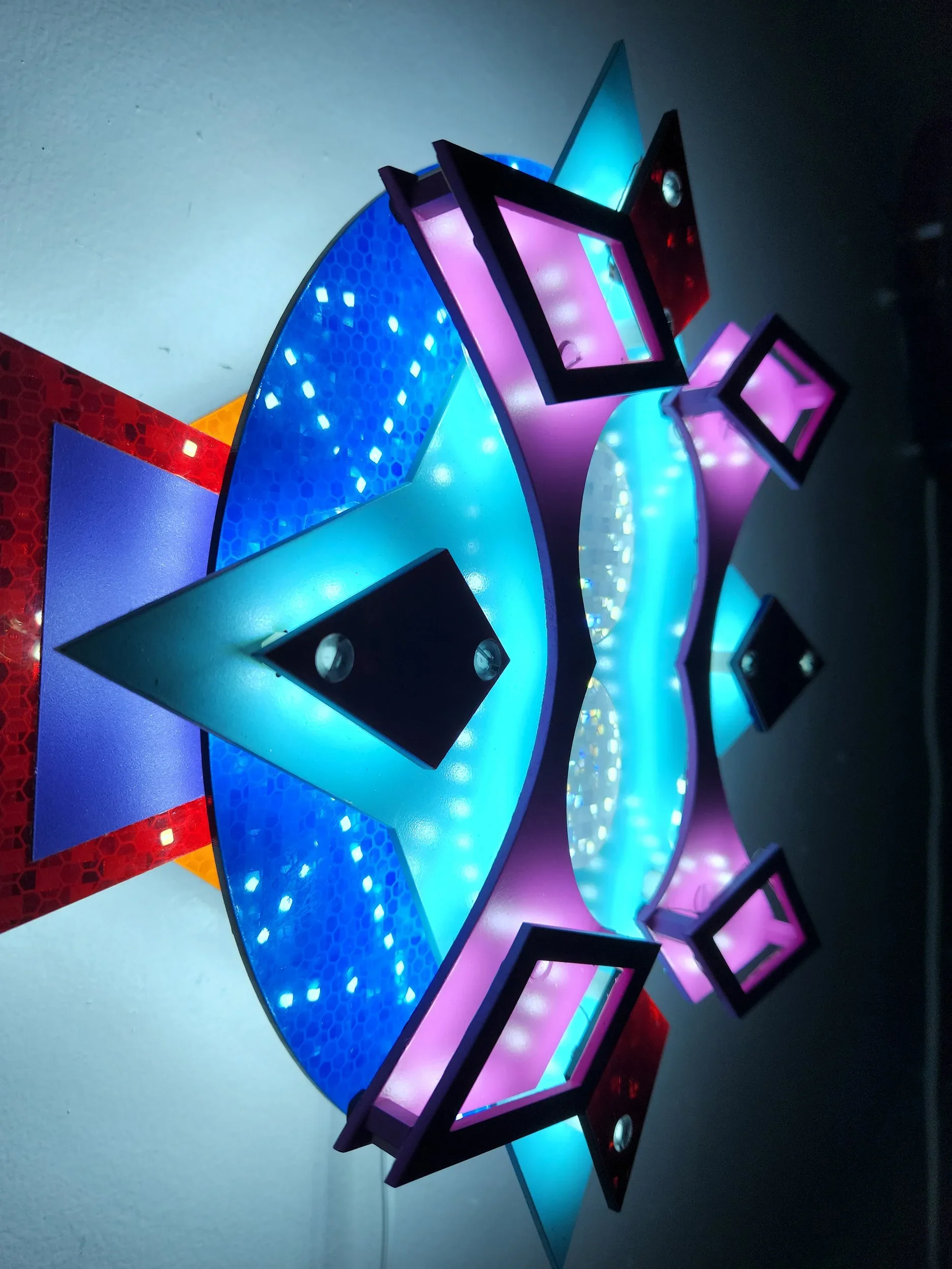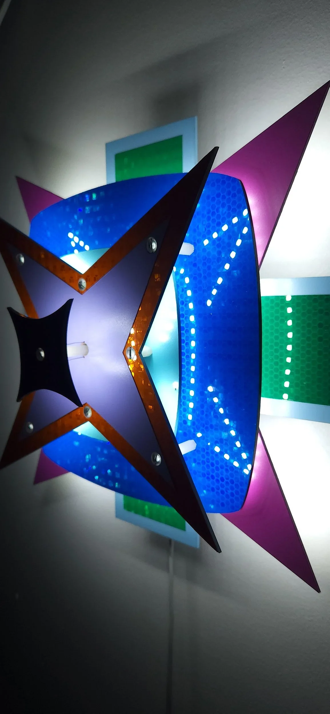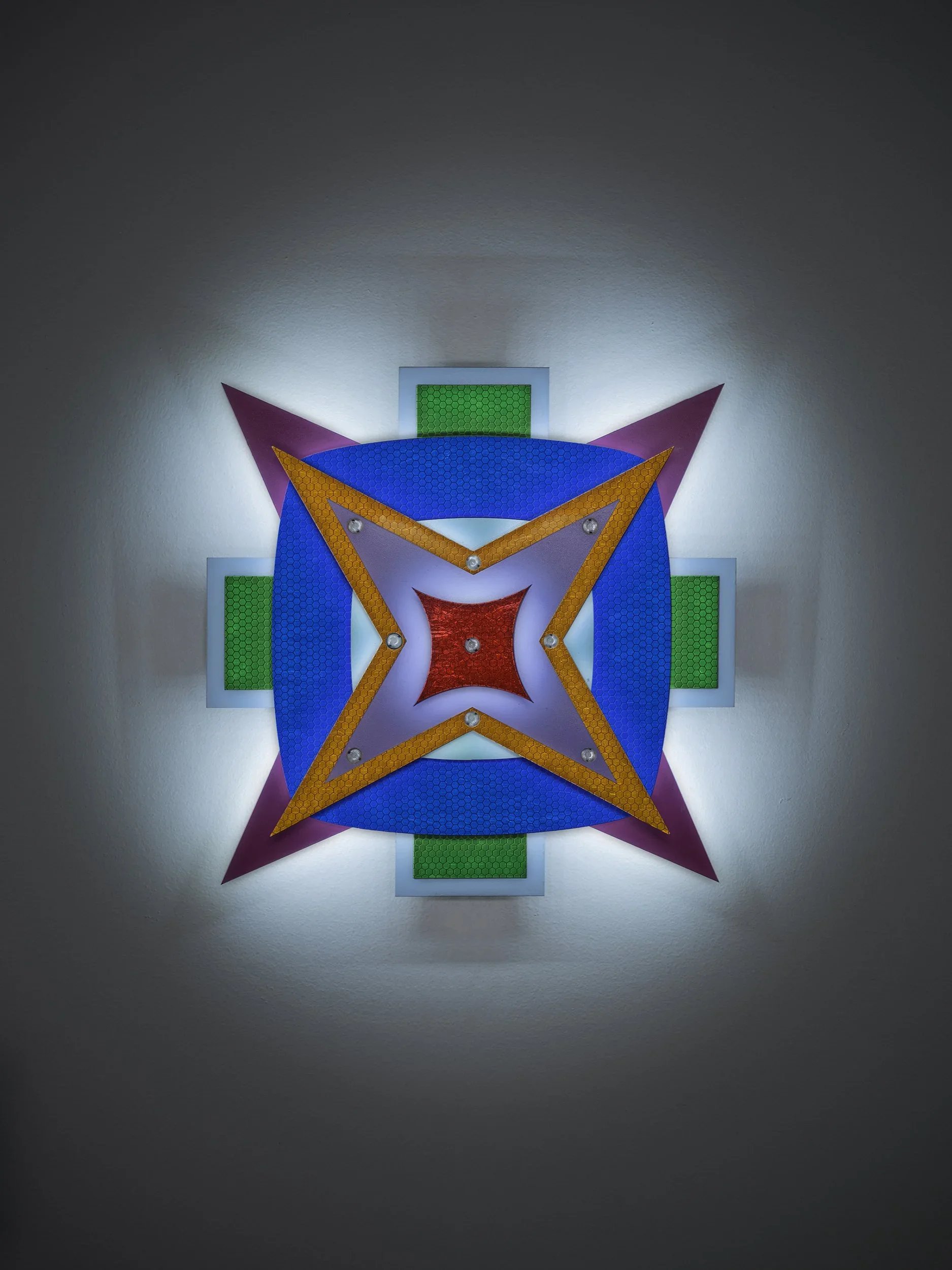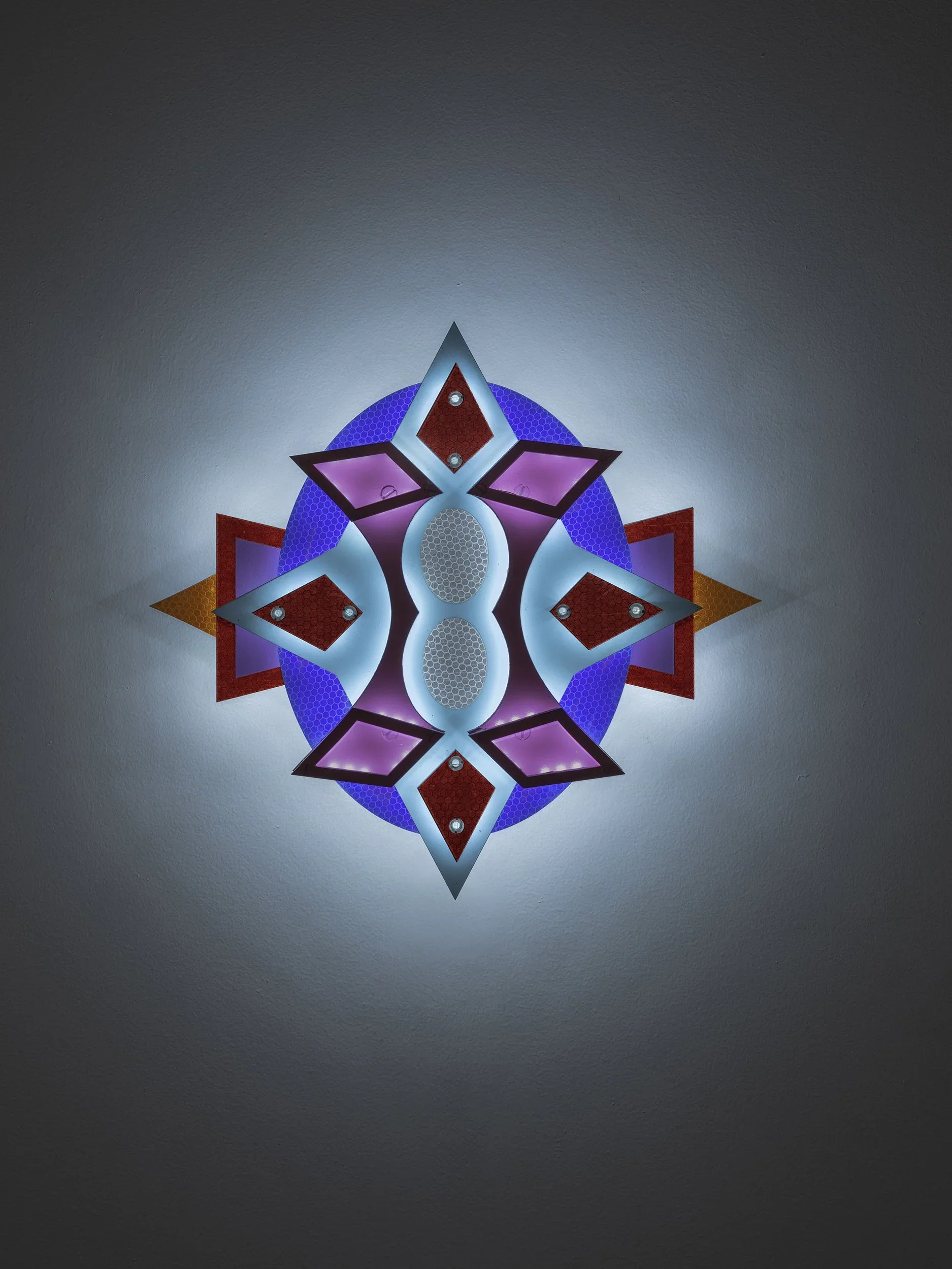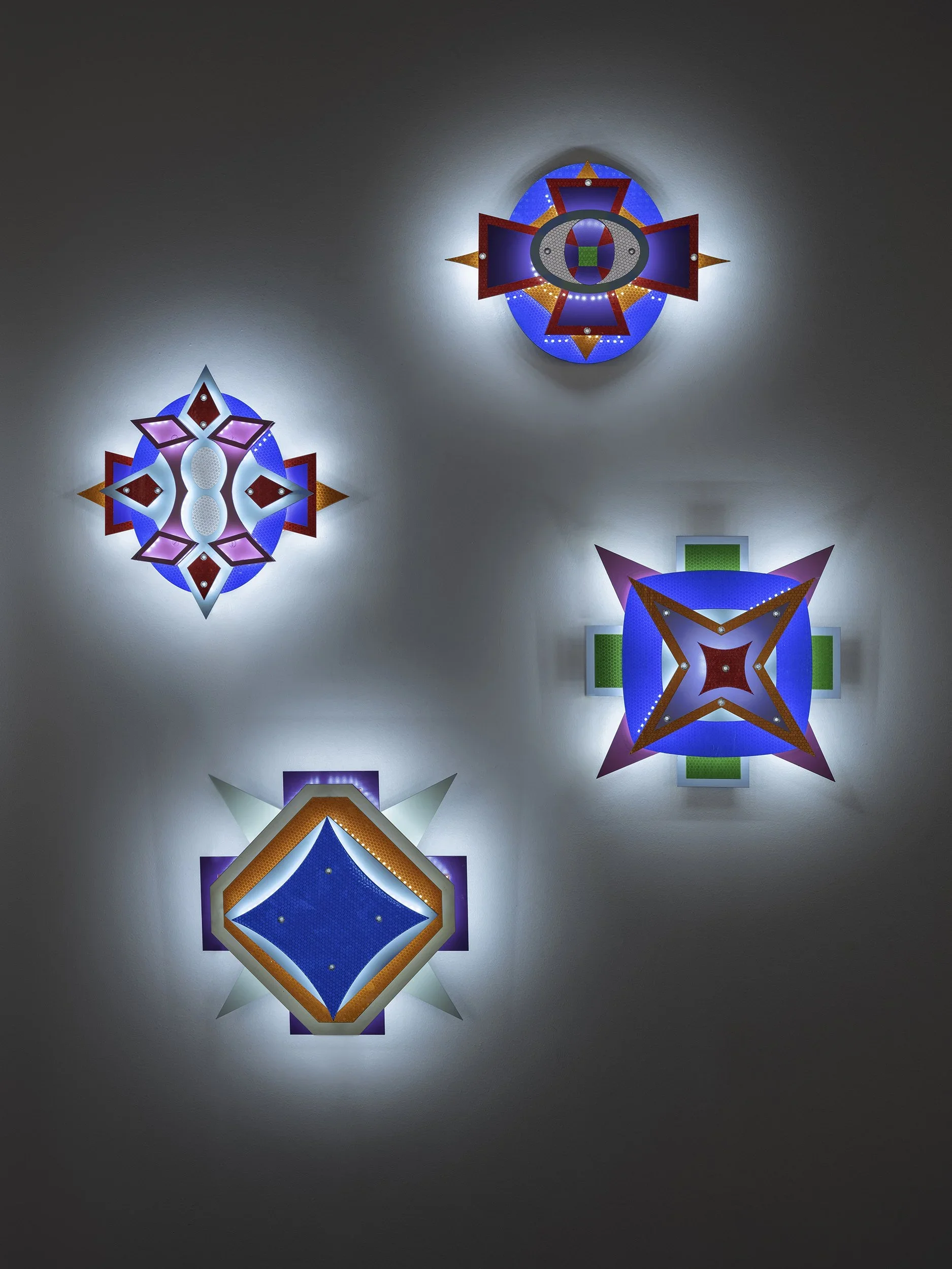 These complex geometric compositions are made with many layers of light and color. In some, LEDs of different kinds provide light in the front of each layer as well as in the back