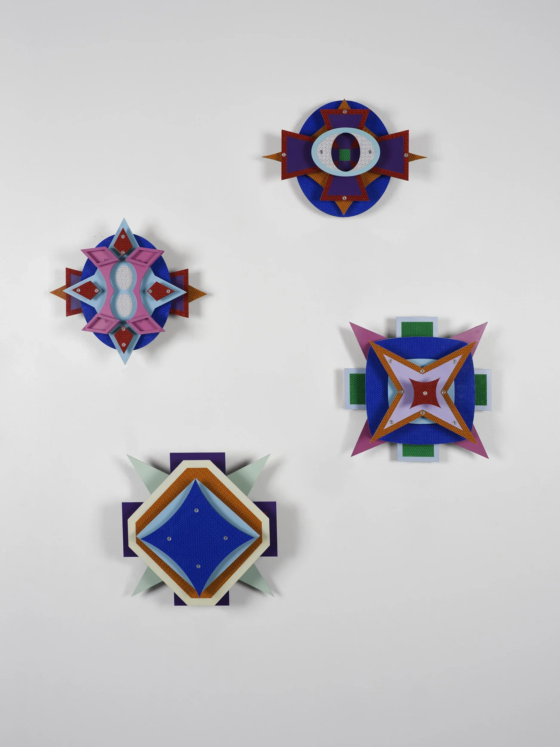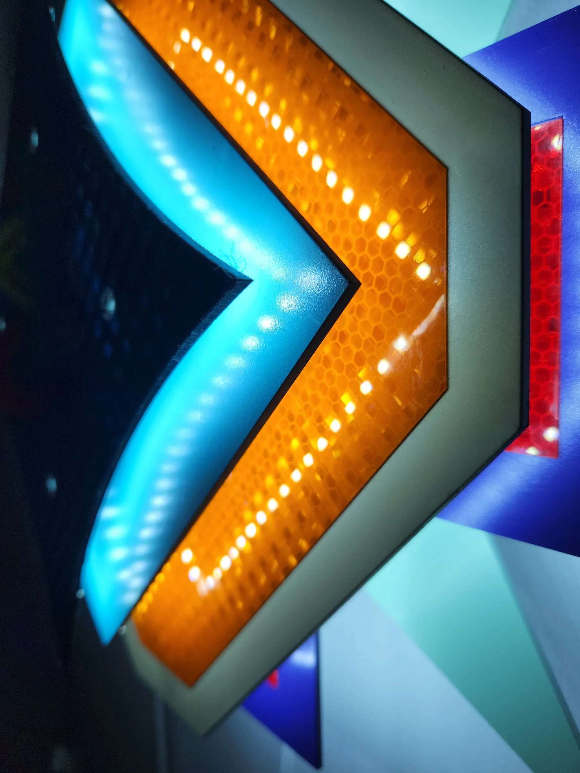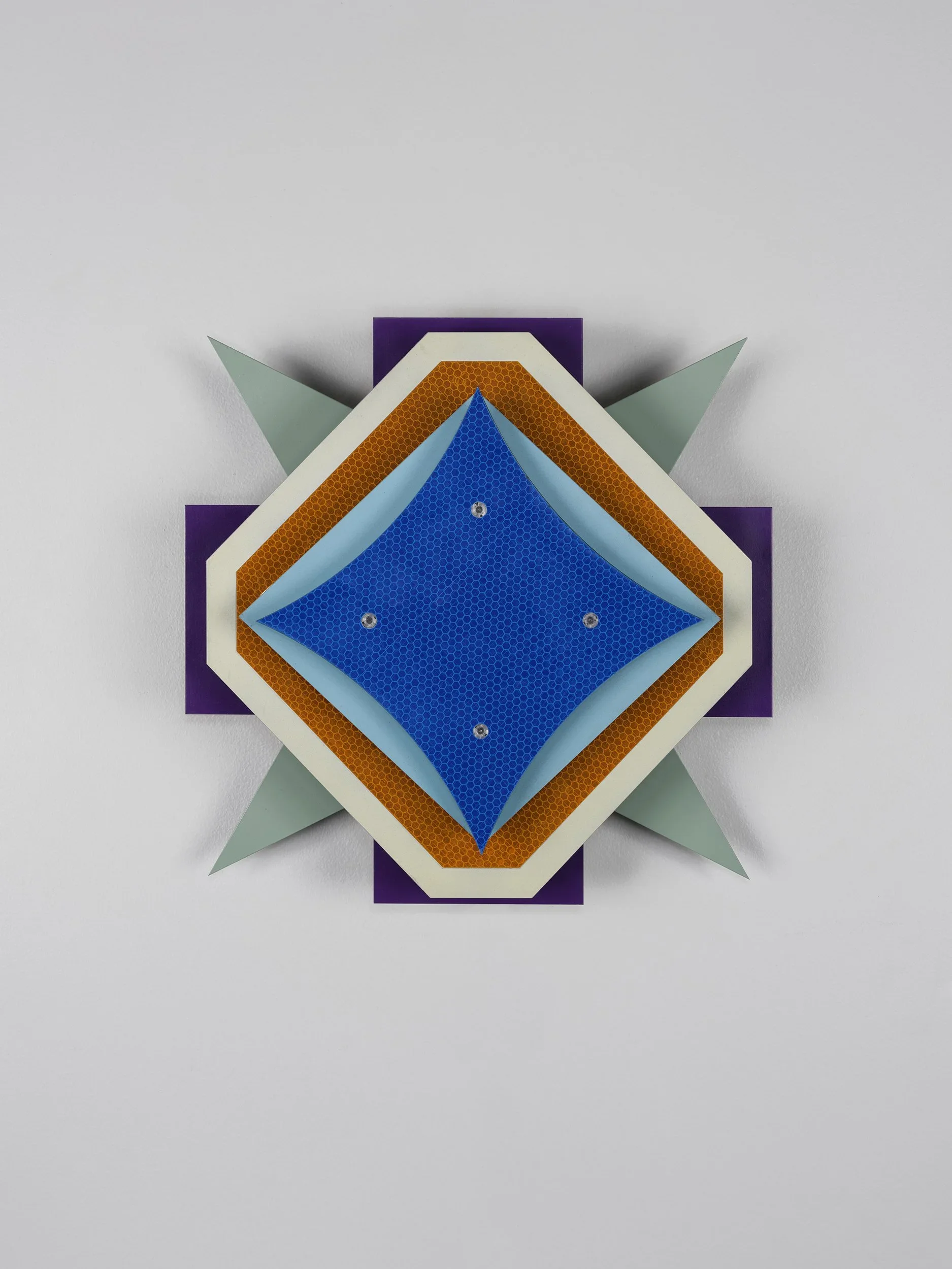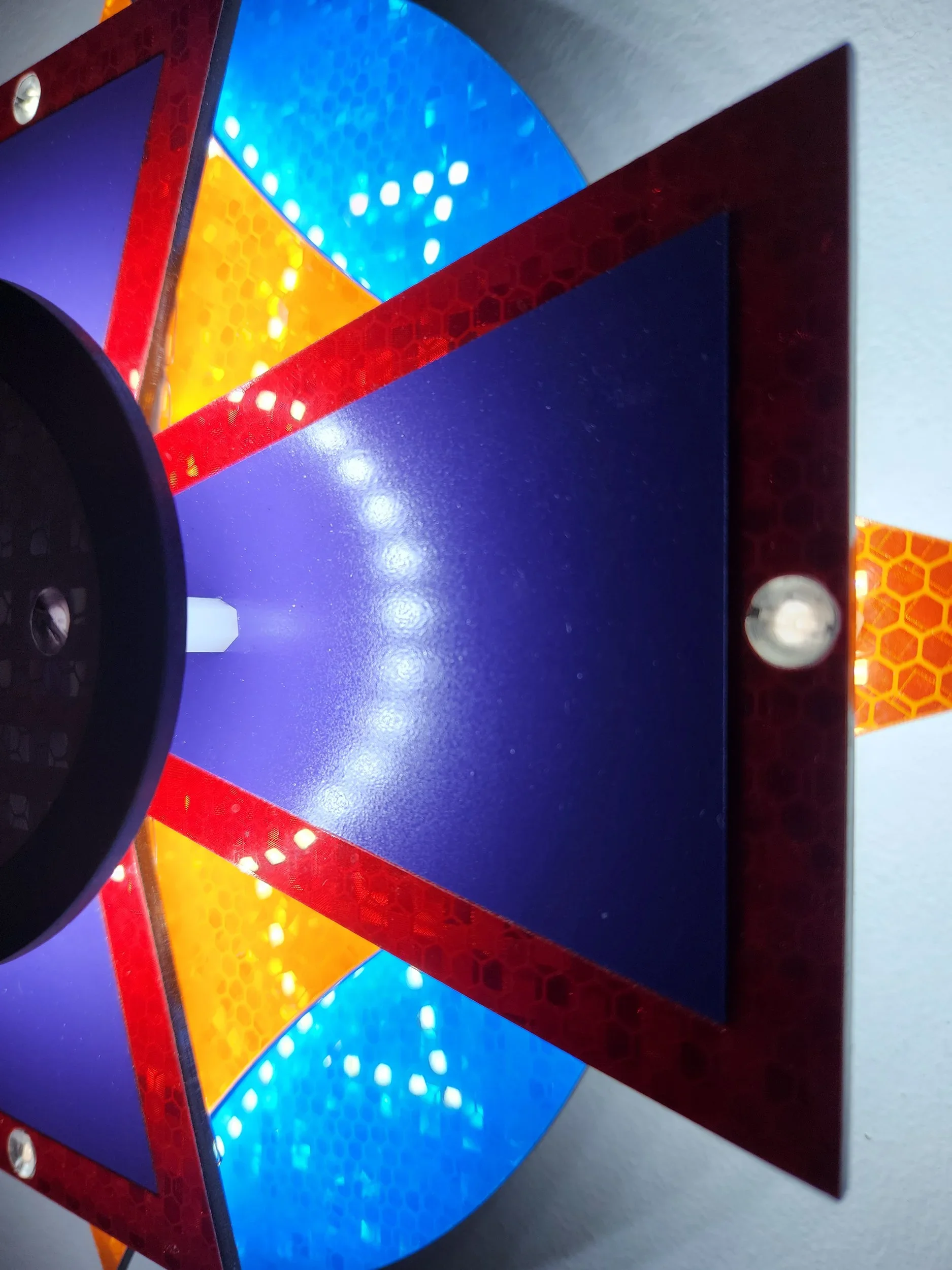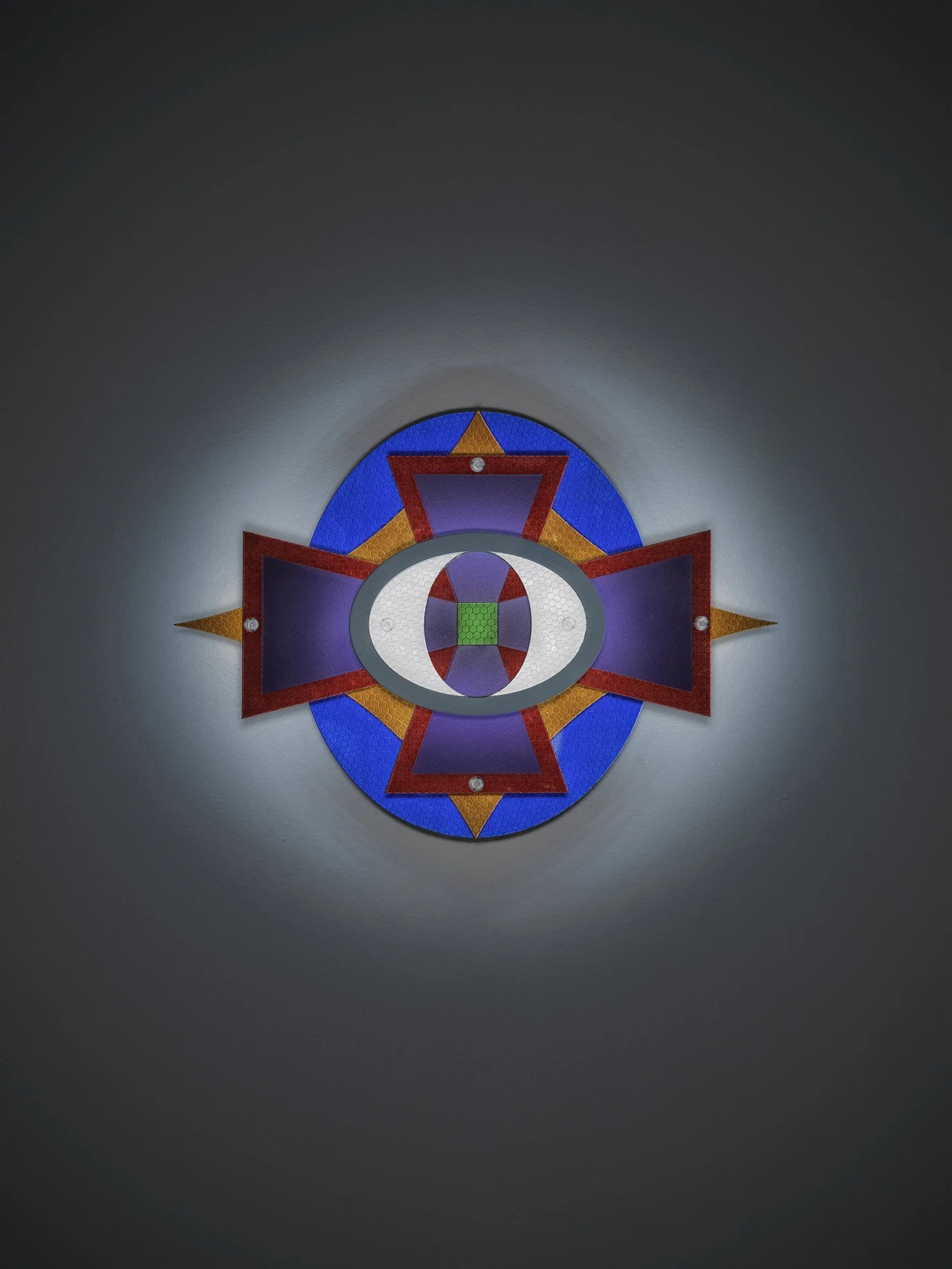 These complex geometric compositions are made with many layers of light and color. In some, LEDs of different kinds provide light in the front of each layer as well as in the back