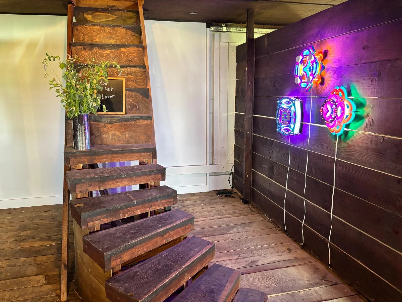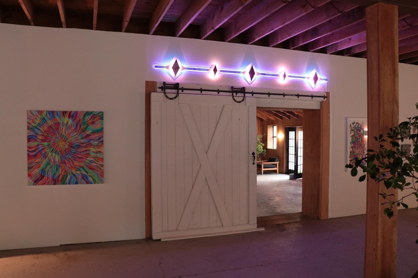At Callisto Farms Double Diamond custom-fitted to the width of the doorway, 124” wide. It was originally shown at Odetta Gallery, where it had more elements that were tucked into the structural beams over its plate glass window.