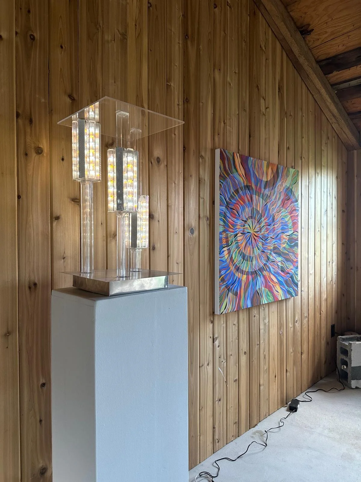In this series I use prism rods, LEDs, road sign material and paint to make sculptures that are beautiful whether their lights are on or off. Yellow and white LEDs are hand-soldered into clear corner rods, and aimed into aluminum corners thus multiplying their reflections; prism rods were placed in front of them, blending their colors for a jewel-like effect. In between them are panels coated with white reflective road sign material, whose tiny beads catch the light from many different angles for a magical glow. Color is palpable, almost tactile. The entire effect plays with the viewer’s depth perception, and thus the perception of the sculpture’s size itself. It plays on your emotions, and takes you into a different, metaphysical world.