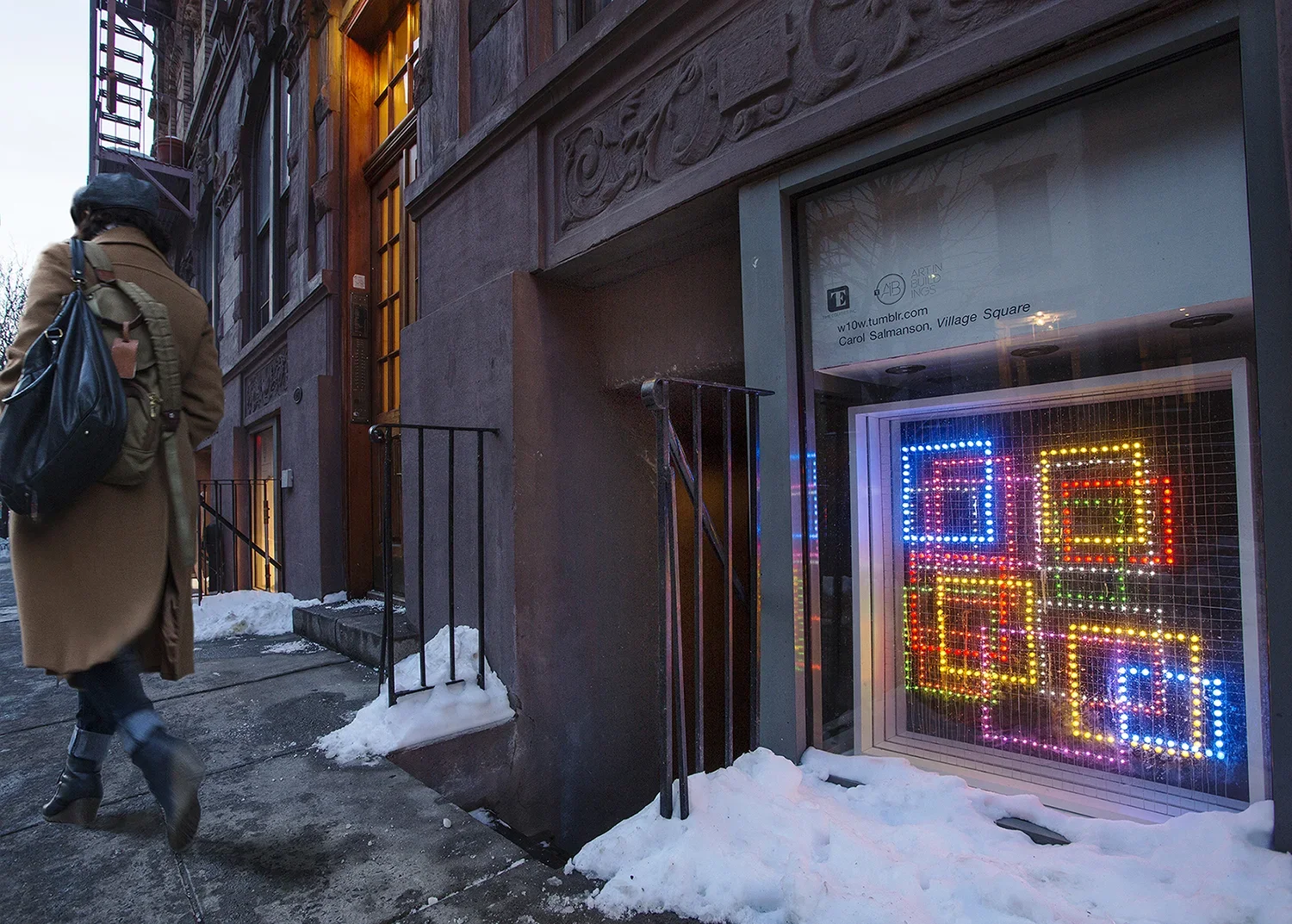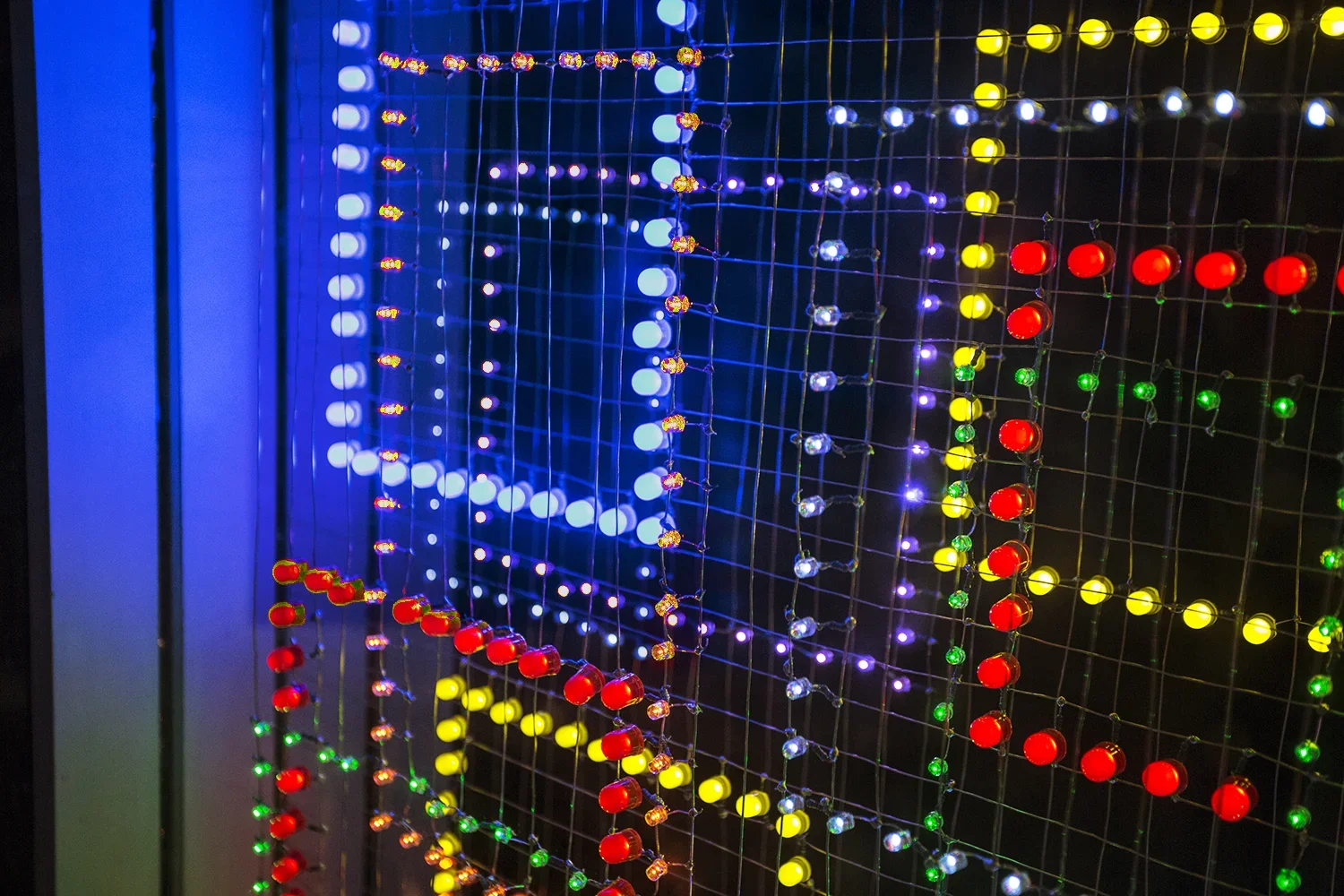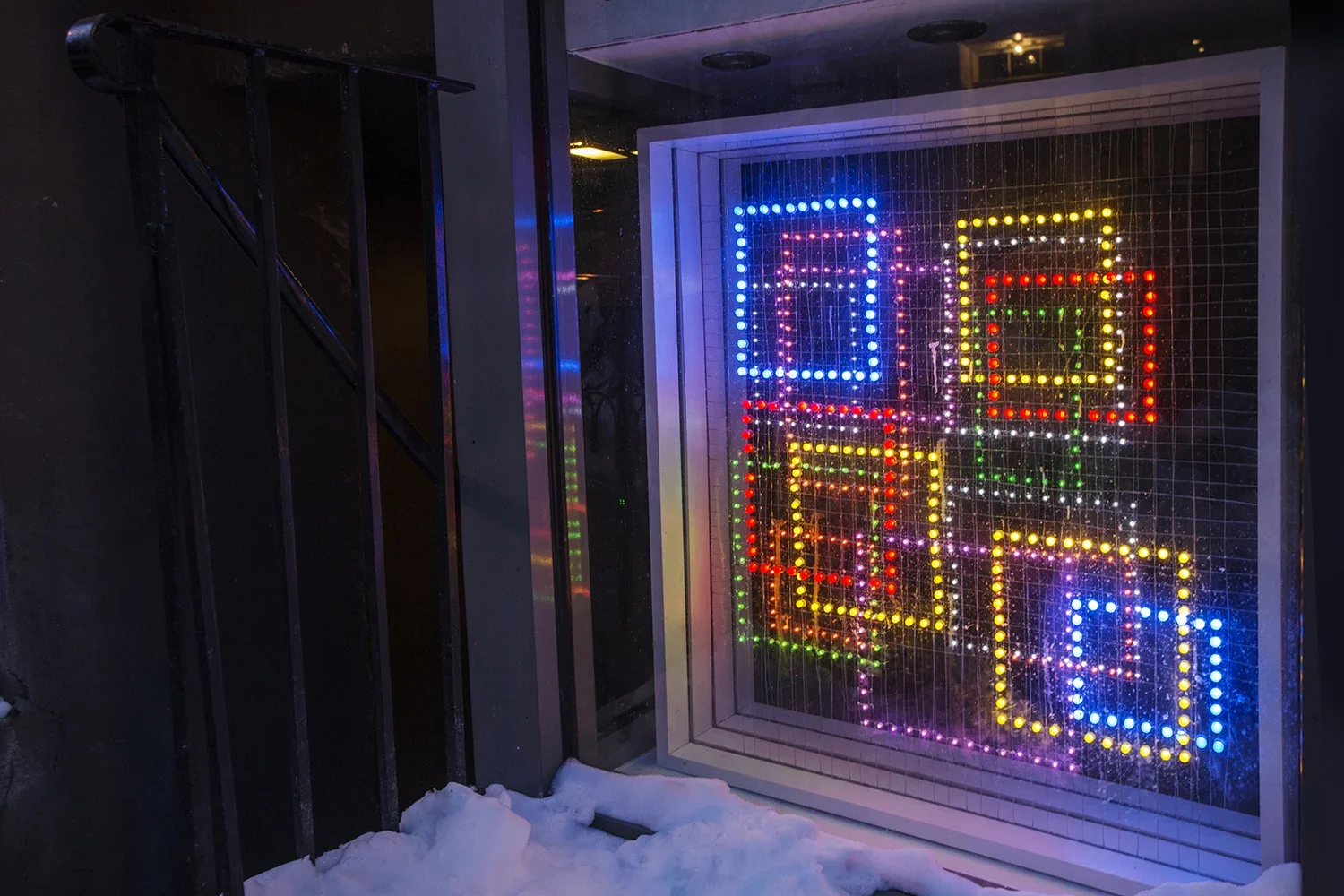 The proportions of the West 10th Window suggested the combination of seven different colors, shapes, and sizes of LEDS arrayed in three layers, to create a constellation of squares hovering in the space. Wires and welds were not only visible but, incorporated into the work as if elements of delicate line drawings. This multilayered approach resulted in an installation that alluded to drawing in space by day and illuminated the window by night.